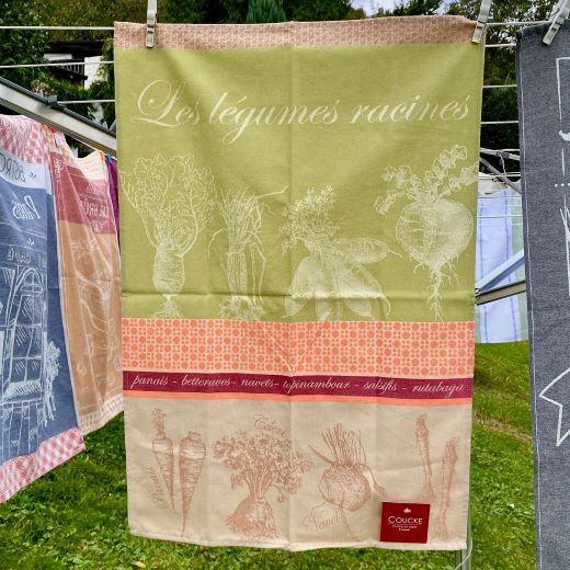 Dieses französische Geschirrtuch mit den farbenfrohen Motiven von Wurzelgemüse bringt einen Hauch von französischem Landleben in deine Küche.