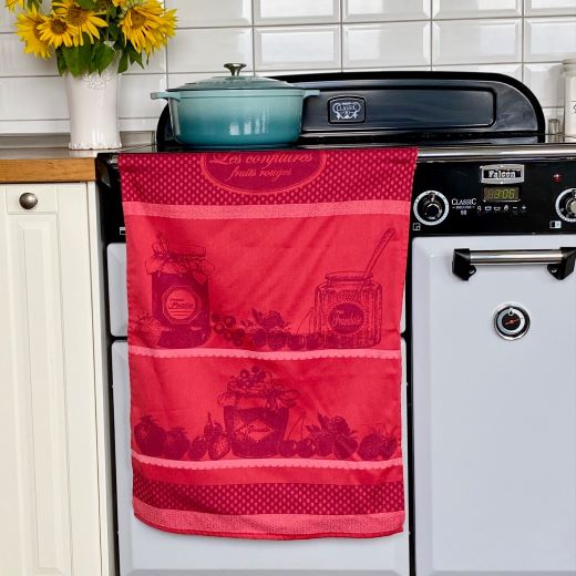 Das Tuch ist tiefrot und mit den eingewebten Marmeladengläsern und Früchten bringt es dir französischen Flair nach Hause.