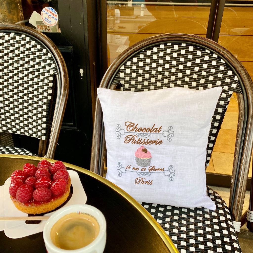 Ich habe den Kissenbezug mit viel Liebe und Sorgfalt in meiner Manufaktur für dich angefertigt und mit dem wunderschönen Patisserie de Paris Motiv bestickt.