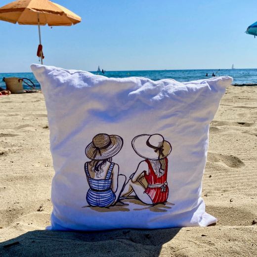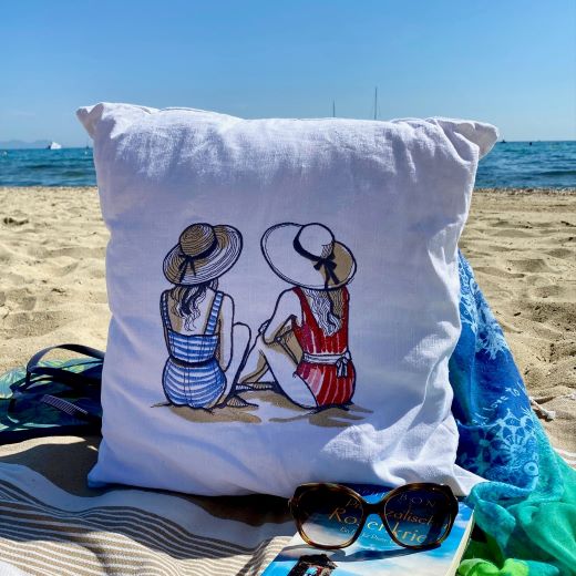 Ich habe den Kissenbezug aus Vintage Leinen genäht, welches ich auf dem Flohmarkt eines kleinen südfranzösischen Dorfes gefunden habe. Die zauberhafte französische Stickerei „Les deux dames au bord de mer“ harmoniert perfekt mit diesem leicht rustikalen griffigen Stoff.