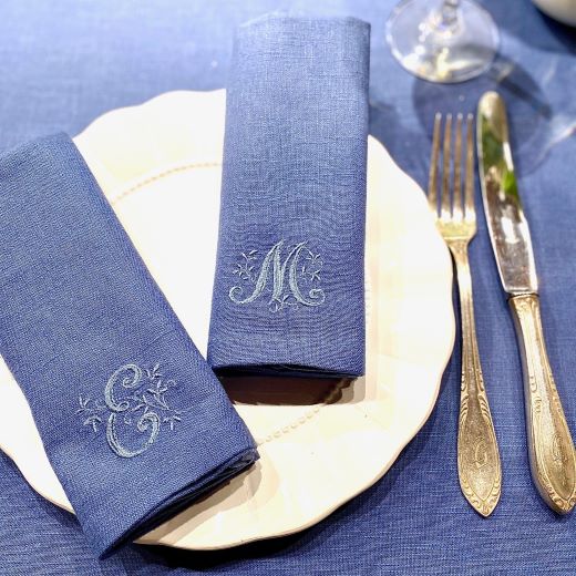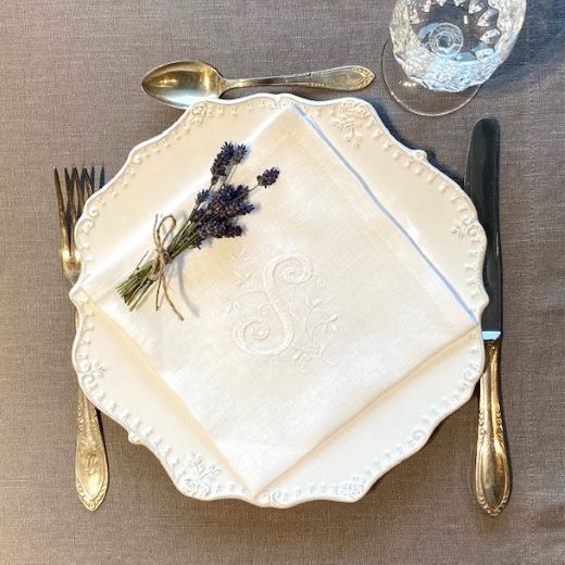 Auf hochwertigem Leinen sorgfältig aufgestickt, heißt ein blumiges Monogramm jeden Gast bei Tisch herzlich willkommen und lädt zum gemütlichen verweilen ein.