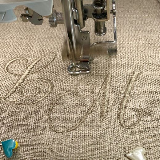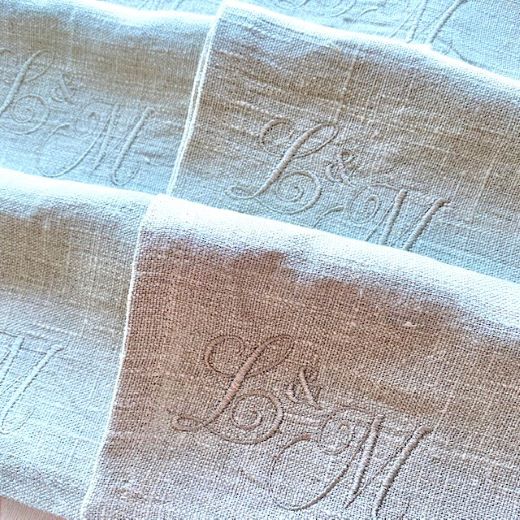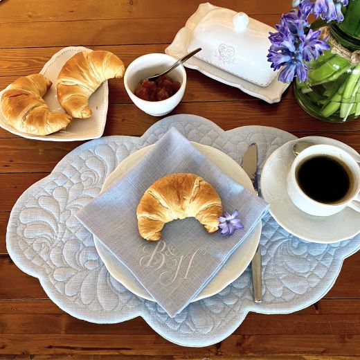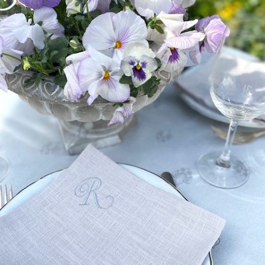 Auf hochwertigem Leinen sorgfältig aufgestickt, heißt ein Monogramm jeden Gast bei Tisch herzlich willkommen.