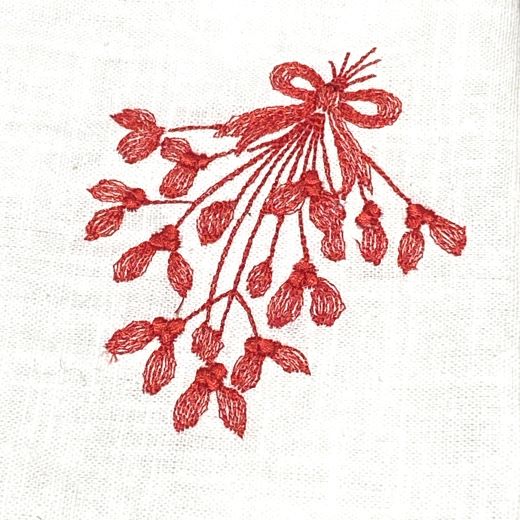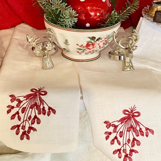 Sehr gern nehme ich die nette Geste auf und bringe den hochwertig gestickten Mistelzweig auf sorgfältig verarbeitete Leinenservietten.