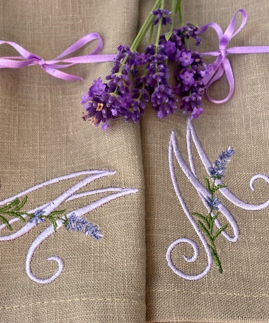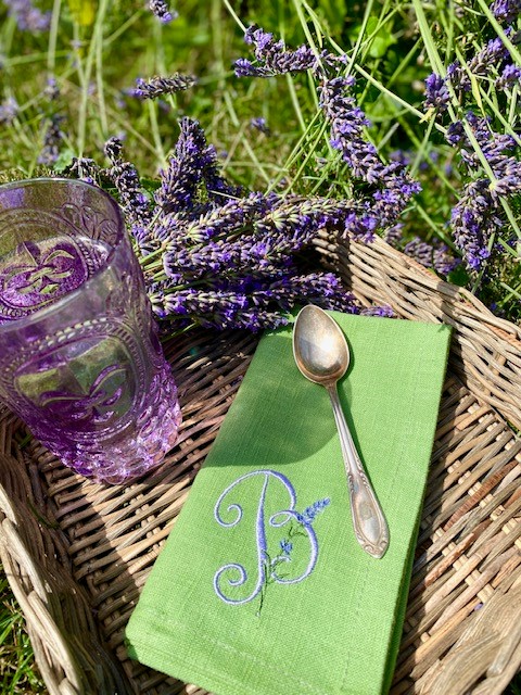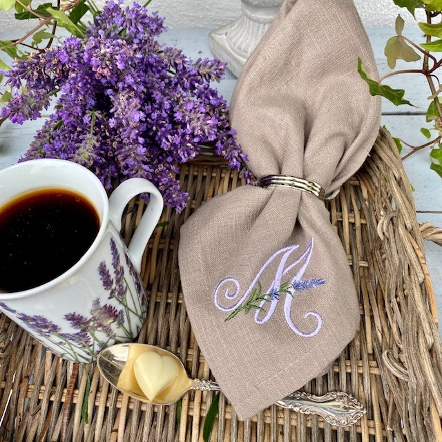 Eine zarte Lavendelblüte umschlingt deinen Wunschbuchstaben und macht jede Serviette so zu einem einzigartigen Unikat mit französischem Flair.