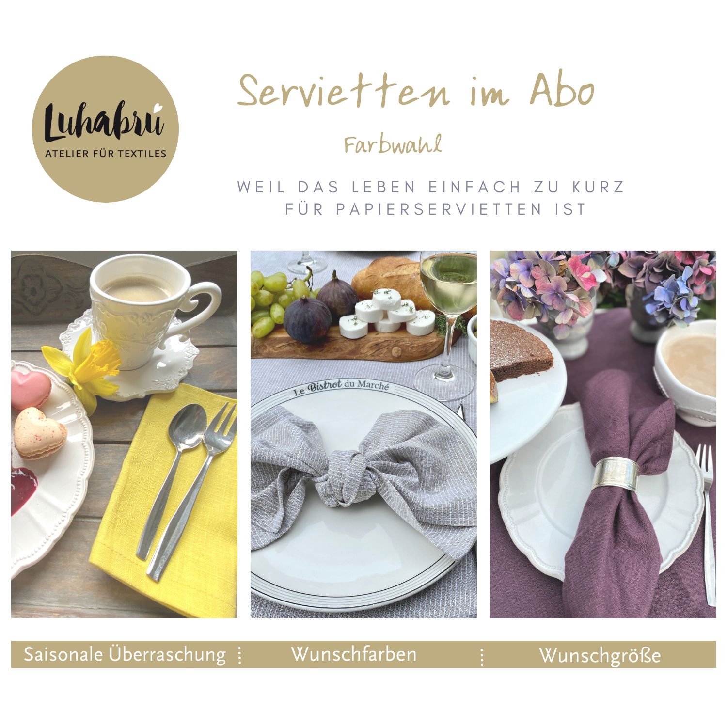 • für mehrere Personen bestelle bitte die gewünschte Anzahl an Abos (4 Servietten = 4 Abos)