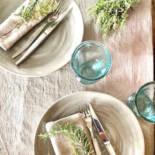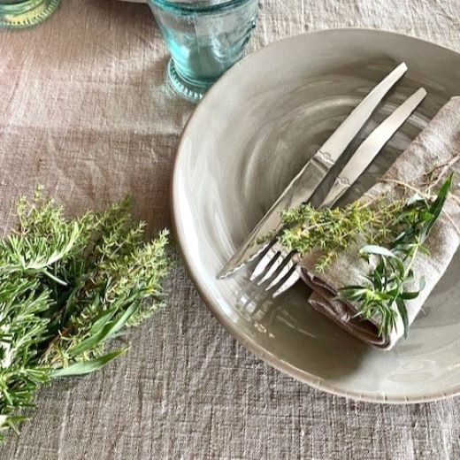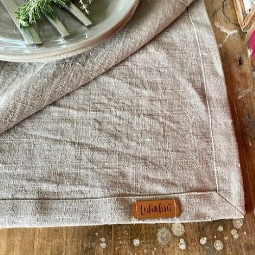 Aus hochwertigem europäischen Rohleinen hergestellt, zeigt die Tischdecke durch ihre natürliche und grobe Struktur des Stoffes ihren rustikalen und robusten Charakter. Sie überrascht aber auch mit charmanten Details wie dem Duft nach Flachs, Wiese und Natur.