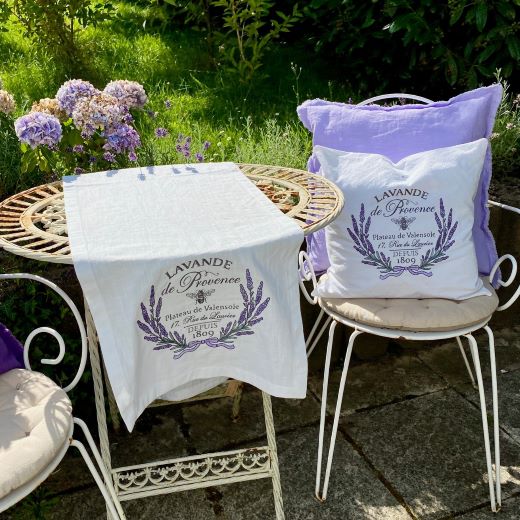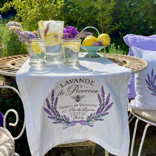Für ein harmonisches Gesamtbild passt dieser Läufer wunderbar zu den Leinenservietten mit Lavendelstickerei oder zu schlichten Servietten in Lavendelfarben.